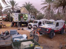 Einer nur drei stündigen Nachtruhe folgte die Überfahrt zur Oase Ksar Ghilane. Hier sollten wir nun fast die ganze Rallye verbleiben und schrauben. Und wir hatten nicht wenig zu tun. Eine der Tagesetappen war schon gestartet und wir wollten gerade frühstücken. Plötzlich stand Peter, der Co von Ulli, in unserem Camp und berichtete außer Atem, dass Ulli hinter der Oase in den Dünen steht und keinen Vortrieb mehr hat.