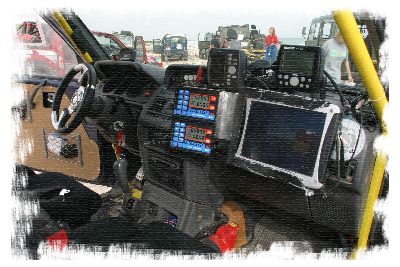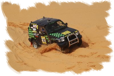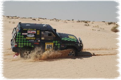 Selbst 200 km Dünen sind auf einer Profirallye nicht alltäglich. Das einzige was uns gefehlt hat sind Reifen. Durch die großen und weiten fortlaufenden Sprünge und Drifts auf den Pisten hatten wir starke Schäden an den Reifen zu verzeichnen. Handteller große Stücke haben sich aus den Laufflächen gelöst. So haben wir vor der letzten Bergetappe den Taschenrechner benutzt, und wir haben die eventuell anfallenden Strafzeiten bei nicht befahren der Etappe ausgerechnet. Das Ergebnis war knapp, aber wir haben beschlossen die vorletzte Etappe nicht mehr zu fahren. In dieser Zeit haben wir mit unserem Service LKW mal die Sehenswürdigkeiten von Tunesien besucht. So standen die alten Rommelstellungen und das Colosseum von El Djem auf dem Plan. Die letzte Etappe am Strand war nicht lang, aber führte noch einmal durch ein Chott ( Salzsee ). Eine sehr schlammige Passage. Aber auf Grund der Platzierung sind wir ziemlich weit vorn gestartet und ein bisschen Glück und viel Power waren auch dabei.