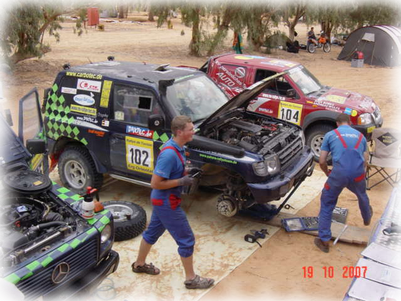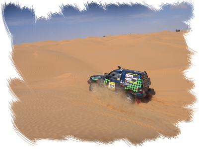 In Ksar Gilane ( Oase in der Sahara ) hatten wir zwei Rundkurse zu fahren. Der erste Rundkurs war zwar nur 90 km lang, jedoch waren die Dünen sehr schwer zu fahren. Einige Teams sind schon nach den ersten Kilometern ins Aus geraten. Dass dieser Rundkurs schwer wird, haben wir schon bei der Fahrerbesprechung am Vorabend geahnt. Denn die Vorgabezeit wurde auf 8 Stunden festgesetzt. 8 Stunden für 90 km wo ist hier das Problem, würde man sagen.