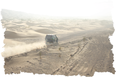 Wir haben uns die ersten 40 km wirklich gequält, und dann das Team Köpp getroffen. Dieser ist mit einer verbogenen Spurstange liegen geblieben. Wir haben gemeinsam die Spurstange gerichtet und uns wieder auf den Weg gemacht. Nach weiteren 10 km hat der Blick auf die Tankanzeige uns in Schrecken versetzt. Alle. Das kann doch nicht sein. OK, Ruhe bewahren und erst einmal eine Zigarette und Wasser. Unten war kein Leck zu sehen. Ist das Renne für uns gelaufen? Navigator Astrid hat unseren Standort festgestellt und der Ausstieg aus dem Dünenfeld war ohne weiteres möglich. Aber wo war der Sprit hin. Nach der kleine Pause wieder der Blick auf die Anzeige--- Tank ist wieder halb voll. Das ständige hin und her hatte das Benzin im Haupttank so gewaltig aufgeschäumt, dass der Schwimmer auf den Boden sacken konnte. Na gut, ein Blick auf die Uhr und die Zeit war sehr knapp. 40 km in 2 Stunden. Eigentlich nicht zu schaffen. Aber ein Versuch ist es wert. Dieser Versuch wurde mit kleineren Dünen und auch einigen kleinen Pisten belohnt. Angefeuert durch die Streckenposten an den Durchgangskontrollen haben wir genau 30 Sekunden vor Torschluss die Ziellinie passiert.